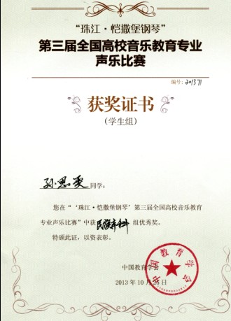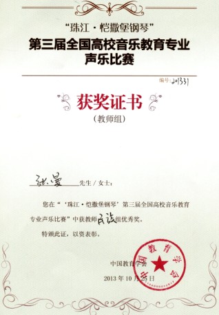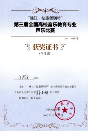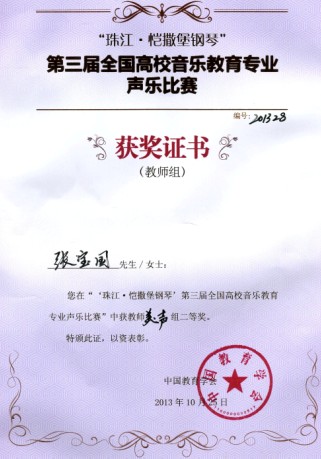 10月20日-25日,由中国教育学会主办,中国教育学会音乐教育分会、西南大学承办的第三届全国高校音乐教育专业声乐比赛在西南大学beat365官方登录隆重举行。beat365官方登录副经理张奕峥副教授亲自带队,经过激烈的角逐,beat365官方登录张宝国老师获得教师美声组二等奖,张曼老师获得教师民族组优秀奖,2010级音乐表演(美声专业方向)员工白思宇获得本科美声组三等奖,2010级音乐表演(美声专业方向)员工赵恩泽获得本科美声组优秀奖,2011级音乐表演(民族声乐专业方向)员工孙思雯获得民族本科组优秀奖。