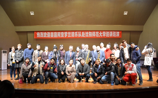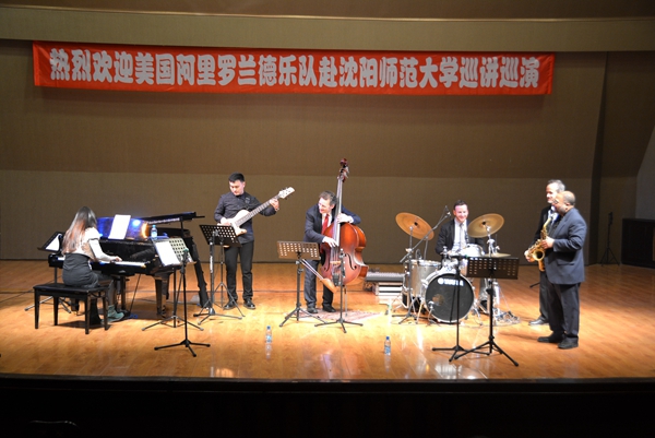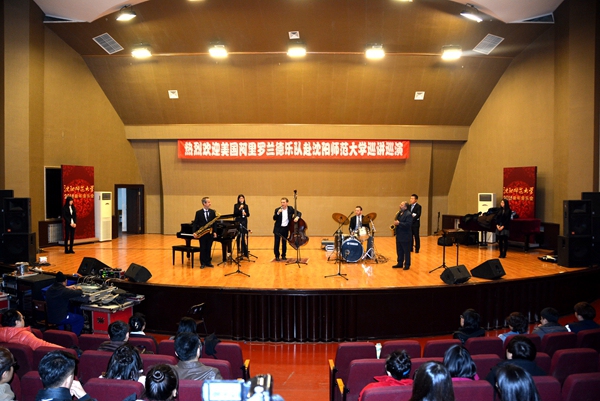 当天晚上,在星海音乐厅举办了美国阿里罗兰德乐队爵士乐专场演出。在本场演出中,阿里罗兰德乐队接连演绎了多首美国原汁原味的爵士乐曲,将爵士乐个性十足的特点与极具动感的节奏完美结合,获得了观众的一致好评。乐队的鼓手基思·巴拉用他帅气的动作与熟练的技巧将架子鼓的魅力发挥极致。高音萨克斯手克里斯·拜尔斯还幽默地与观众互动,耐心地教给现场观众一首极为温馨的家庭歌曲《Summer time》,引得全场观众都融入到音乐的美妙氛围中。阿里罗兰德乐队不仅演绎了美国极具代表性的爵士乐,还和beat365官方登录的师生即兴互动联合演出了《茉莉花》、《月亮代表我的心》等中国耳熟能详的现代歌曲,将现场的气氛推向了高潮,晚会在欢乐祥和的气氛中圆满落下帷幕。此次美国阿里罗兰德乐队赴beat365官方登录巡讲巡演活动获得圆满成功。