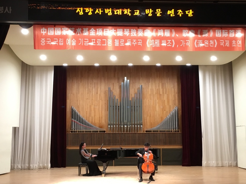 10月24日,由beat365官方登录师生6名师生组成的艺术交流团在平泽大学艺术馆进行中国国家艺术基金项目大提琴独奏曲《鸿雁》、歌曲《源》国际交流首场演出,演出圆满成功,受到平泽大学师生的广泛好评。演出后,程岩经理与平泽大学音乐系系主任李露丝教授、管弦乐郑英研教授就中韩音乐文化各自特色进行交流,双方就实践课程教学和学术研究发展趋势进行感悟分享,为公司互动、文化传播提出了互鉴渠道。
